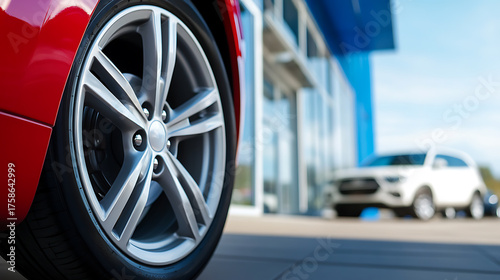 Close-up of a sleek, red car's wheel with a stylish silver rim. A dealership with blue accents in the background adds depth. Shiny exterior, modern aesthetics! Zooming into auto beauty.