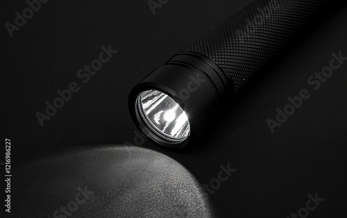 Close-up of a small flashlight against a black and white background, top view. Stock photo contest winner, high-resolution image, high definition.