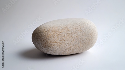 Close-up of a smooth white stone placed perfectly in the center of a solid white studio background for a calming effect.