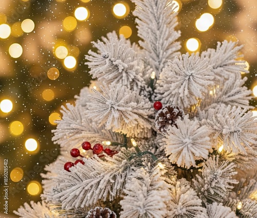 Close-up of a snow-covered pine branch with red berries and warm golden bokeh lights in the background