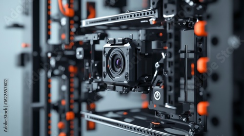 Close-up of a sophisticated camera system mounted on a complex, industrial-looking rig.