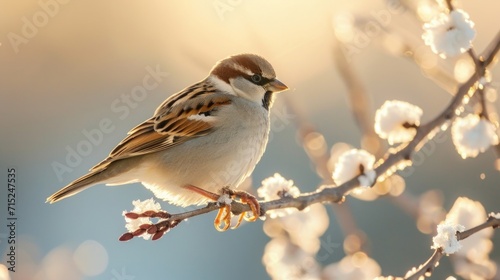 Closeup of a sparrow plucking at fluffy cottonwood seeds while balancing precariously on a thin branch framed by the soft glow of the rising sun on nearby skysers