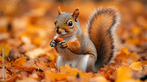 Close-up of a squirrel holding an acorn, with a background of scattered leaves