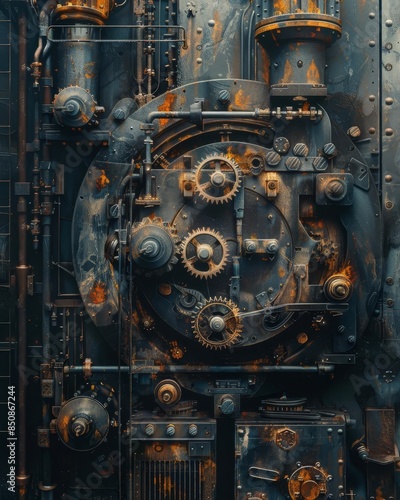 Close-up of a steampunk-style industrial machine with gears and pipes.