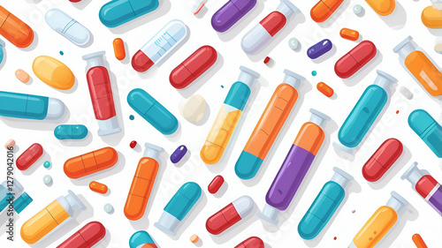 Close-up of a variety of medications and pills arranged in a creative, organized pattern on a clean white surface, Scientific style
