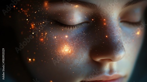 Close-up of a woman's face with glowing particles.
