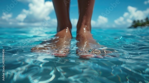 Close-up of a woman's feet dipped in crystal clear tropical waters, showcasing a relaxed vacation vibe.