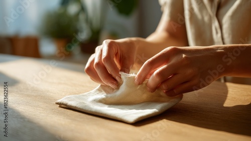 Close-up of a woman’s hands folding a soft fabric napkin on a wooden table in a sunlit room, creating an inviting atmosphere.