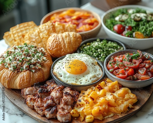 Close-up of a wooden board topped with various breakfast dishes and salad bowls. It is ideal for illustrating menus or highlighting fresh, healthy eating options.
