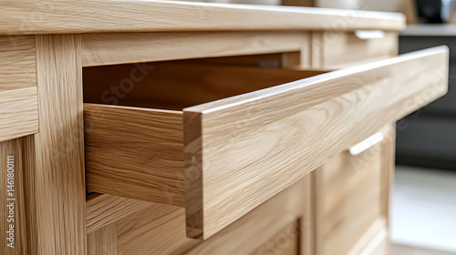 Close-Up of a Wooden Drawer in a Modern Kitchen Cabinet