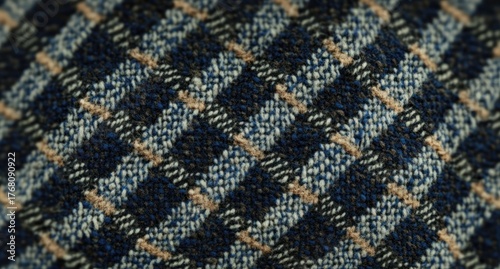 close-up of a woven fabric with a checkered pattern featuring dark blue, light blue, black, and beige colors showing detailed textile texture