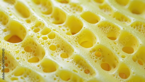 Close-up of a yellow and airy sponge with numerous holes and bubbles.
