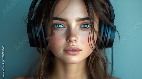 Close-up of a young woman with headphones, her hand adjusting the headphones, against a soft peach-colored backdrop