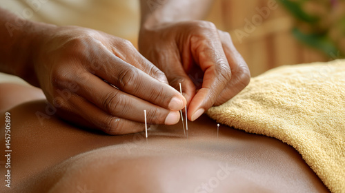 Close-up of acupuncture needles in the shoulder area, focused on fingers and needle point