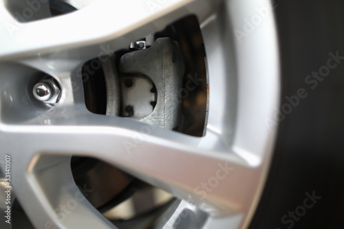 Close-up of aluminum car rims with disc brake. Macro shot of automobile detail. Mechanics garage for diagnostics. Service station and maintenance concept