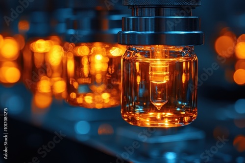 Close-up of amber liquid filled glass bottles moving on a conveyor belt.