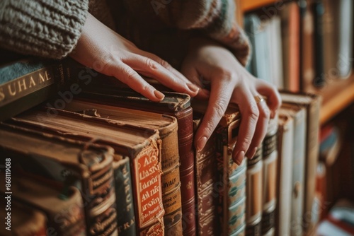Close-up of American hands arranging books on a shelf, focus on titles and organization, detailed and cozy