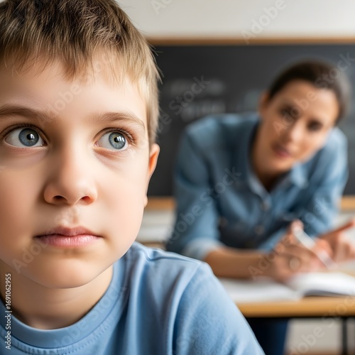 Close-up of an autism spectrum disorder child in classroom, teacher calmly explaining, child’s face reflecting thoughtfulness, curiosity, and slight anxiety, natural light and realism.