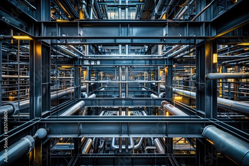 Close-up of an industrial factory background at night, featuring machinery, steel structures, and urban cityscape elements