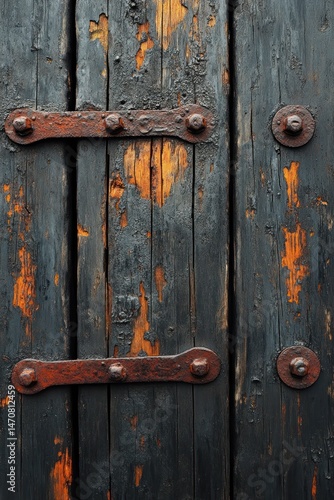 Close-up of an old rustic wooden door with peeling dark paint and rusty metal hinges showing texture and wear