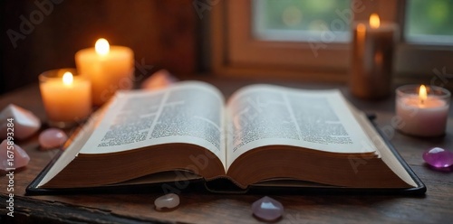 Close-up of an open book resting on a wooden table, surrounded by candles and crystals, bathed in soft, warm light, evoking a sense of peace and spiritual reflection , yoga, new age, magical