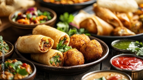 Close-up of assorted Indian delicacies like fried rolls, masala dosa, and kofta curry, beautifully garnished with fresh herbs