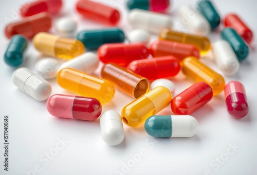 Close-up of assorted vitamin capsules on white, colorful, healthcare