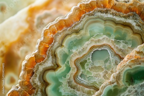 Close-up of banded onyx stone with green and amber layers, showing a textured, natural geologic formation.