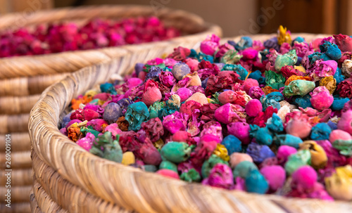 closeup of baskets filled with colorful spices in the market - called souk - of Marrakech, Morocco