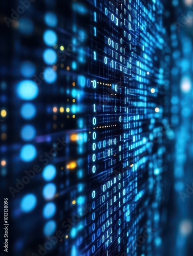 Closeup of binary data in vibrant blue tones displayed on a digital screen Rows of 1s and 0s fading into the background, sharp focus, hightech abstract design