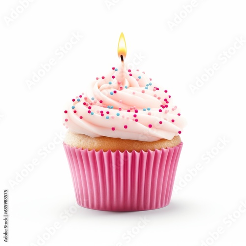 Close-up of birthday cupcake with one candle isolated on white