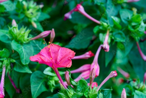 Closeup of blooming pink Mirabilis jalapa flower