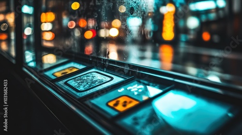 Close-up of Blue and Yellow Buttons on a Window with Defocused City Lights in the Background