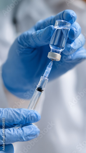 Close-up of blue gloved hands using a syringe to extract clear liquid from a glass vial medical healthcare