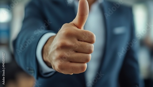 Closeup of boss giving thumbs up to employee, positive reinforcement after successful job completion, office environment