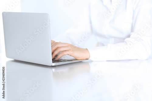 Close-up of business woman hands typing on laptop computer. Secretary at work in office