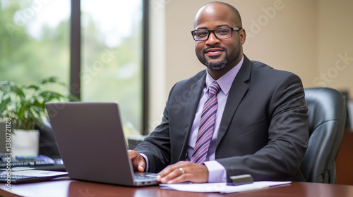Closeup of businessman hand typing on laptop computer at office. Business man working on computer device, searching the information, surfing the internet on table at workplace
