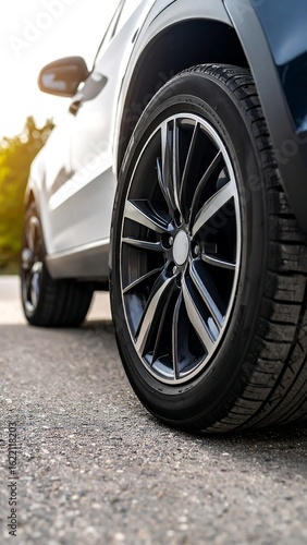Close-up of car wheel on asphalt