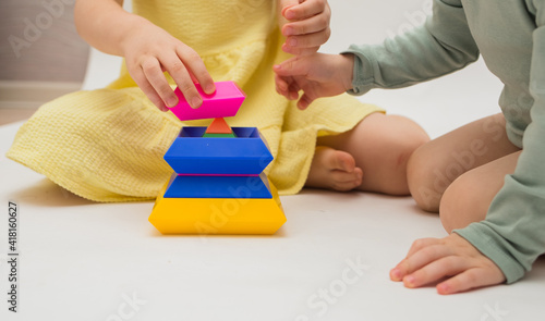 close-up of children playing with a colorful pyramid on a white background