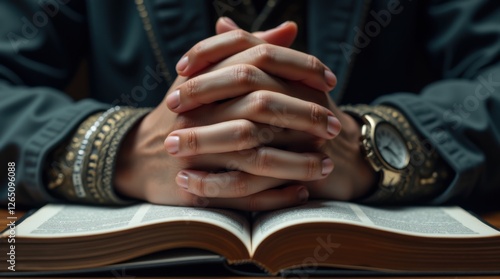 Close-up of clasped hands resting on an open Bible, symbolizing faith, devotion, and prayer in a spiritual moment.
