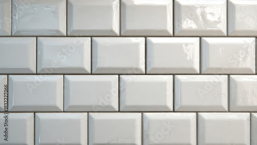 Close-up of classic white subway tiles featuring glossy, beveled edges and subtle surface imperfections, forming a clean, textured wall pattern.