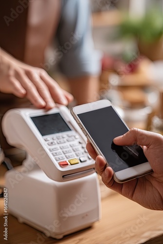 Close-up of contactless mobile payment at a store. Hands holding phone over payment terminal