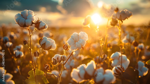 Close-up of cotton blossoms illuminated by the golden light of sunset. The serene and picturesque scene captures the natural beauty of the countryside.