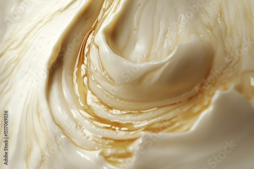 Close-up of creamy texture with honey or caramel, showing smooth and glossy surface, detailed swirls and patterns.