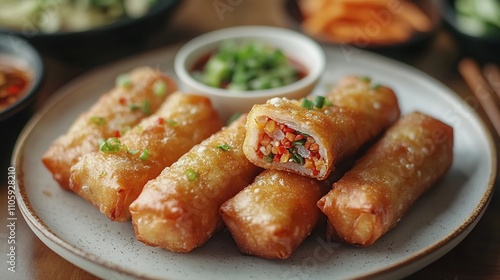 Close-up of crispy fried spring rolls, cut open to reveal savory filling, served with a vibrant dipping sauce and garnished with chopped green onions.