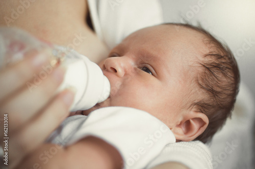 Closeup of cute baby sleeping on mothers hands after eating milk