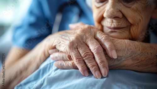 Close-up of elderly hands resting on a caregiver's shoulder, symbolizing support, care, and companionship in senior care.