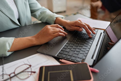 Closeup of elegant black businesswoman using laptop while working in successful career in office, copy space