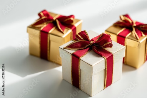 Close-up of elegant luxury Christmas gift boxes wrapped in gold and red paper with satin ribbons, placed on white minimal background with soft shadows, festive and stylish composition
