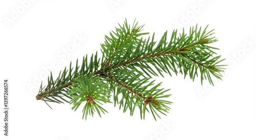 Closeup of evergreen pine branch with green needles against a bright white background for nature theme